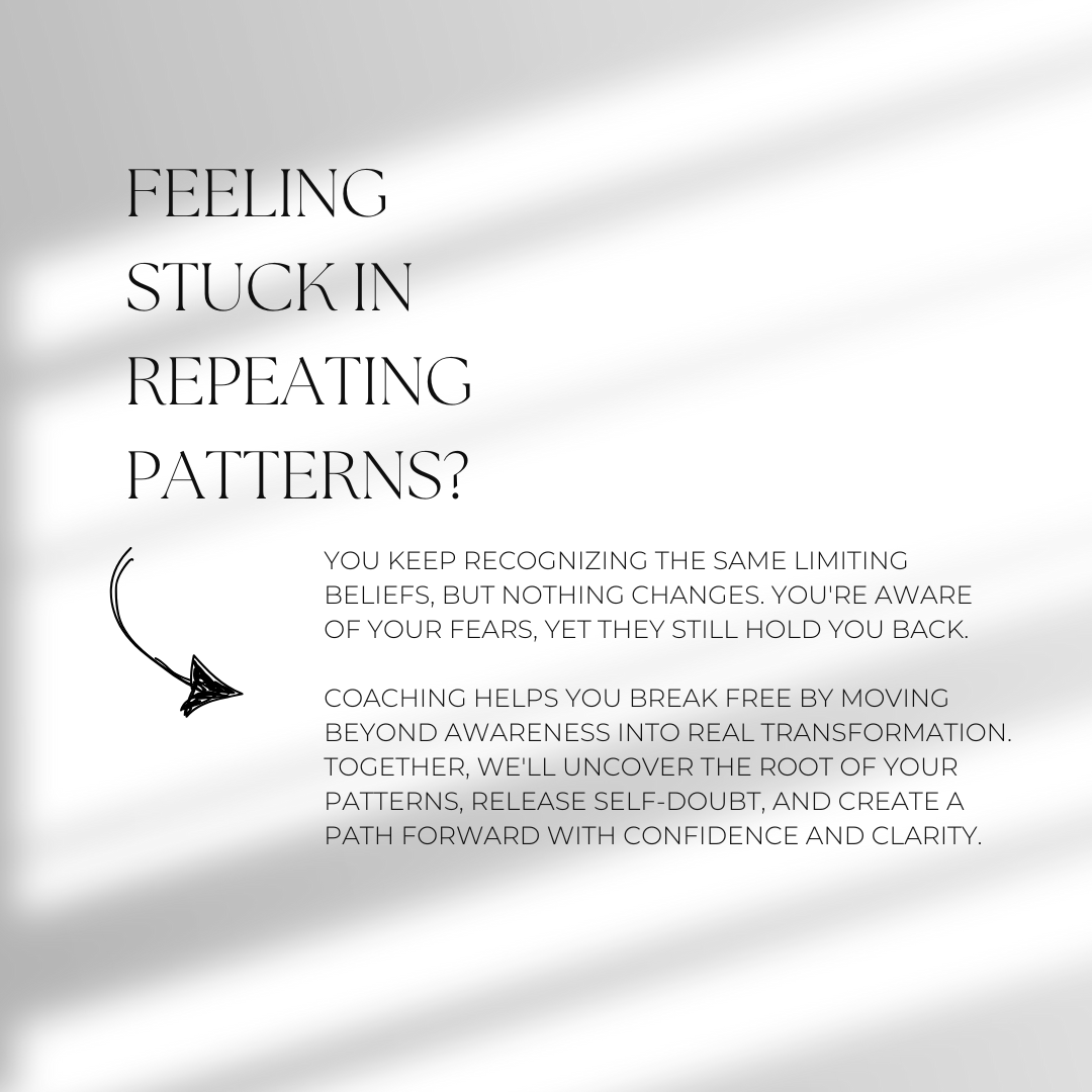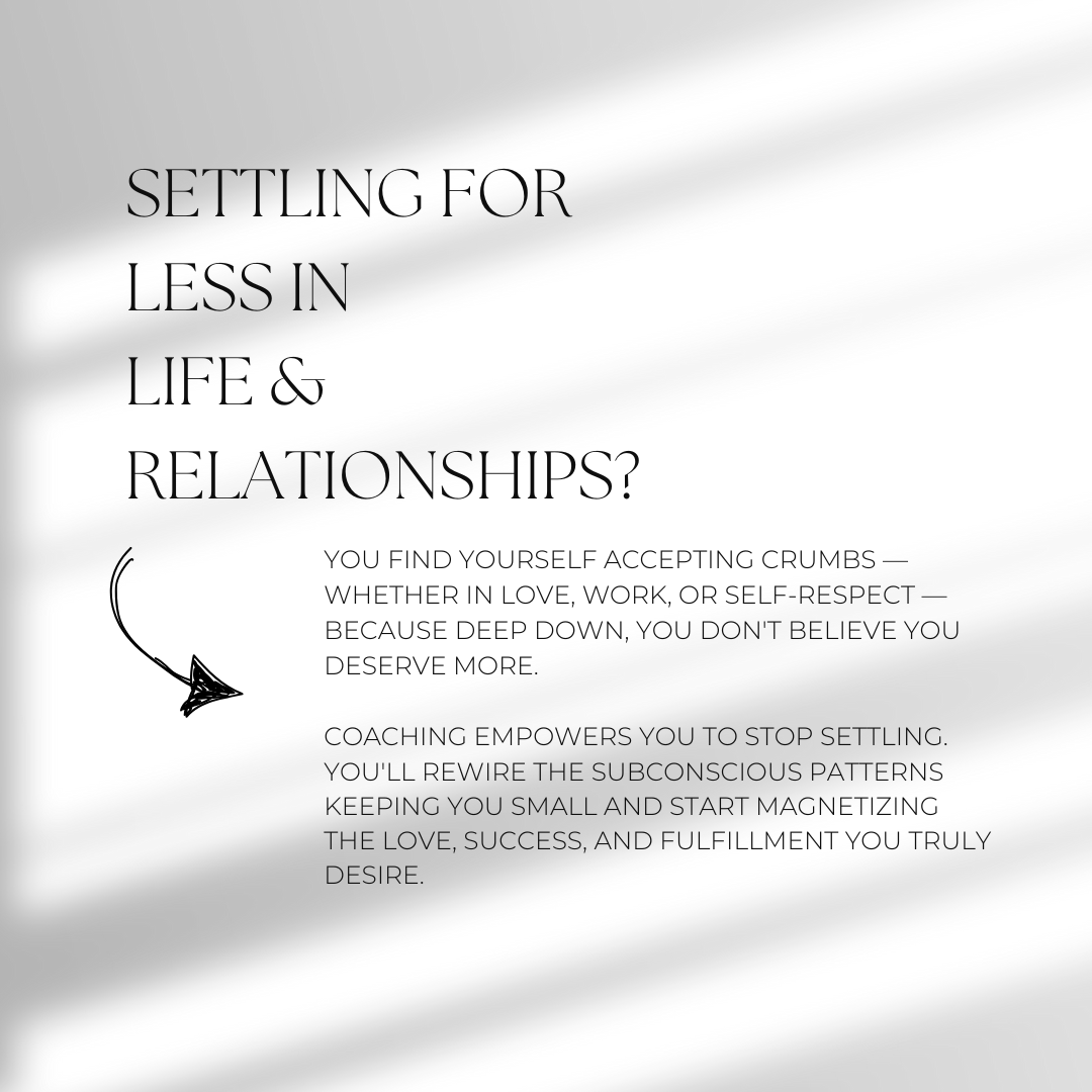 This is deep, transformational coaching to help you break free from the patterns that are keeping you stuck — in love, in self-doubt, and in your own mind.